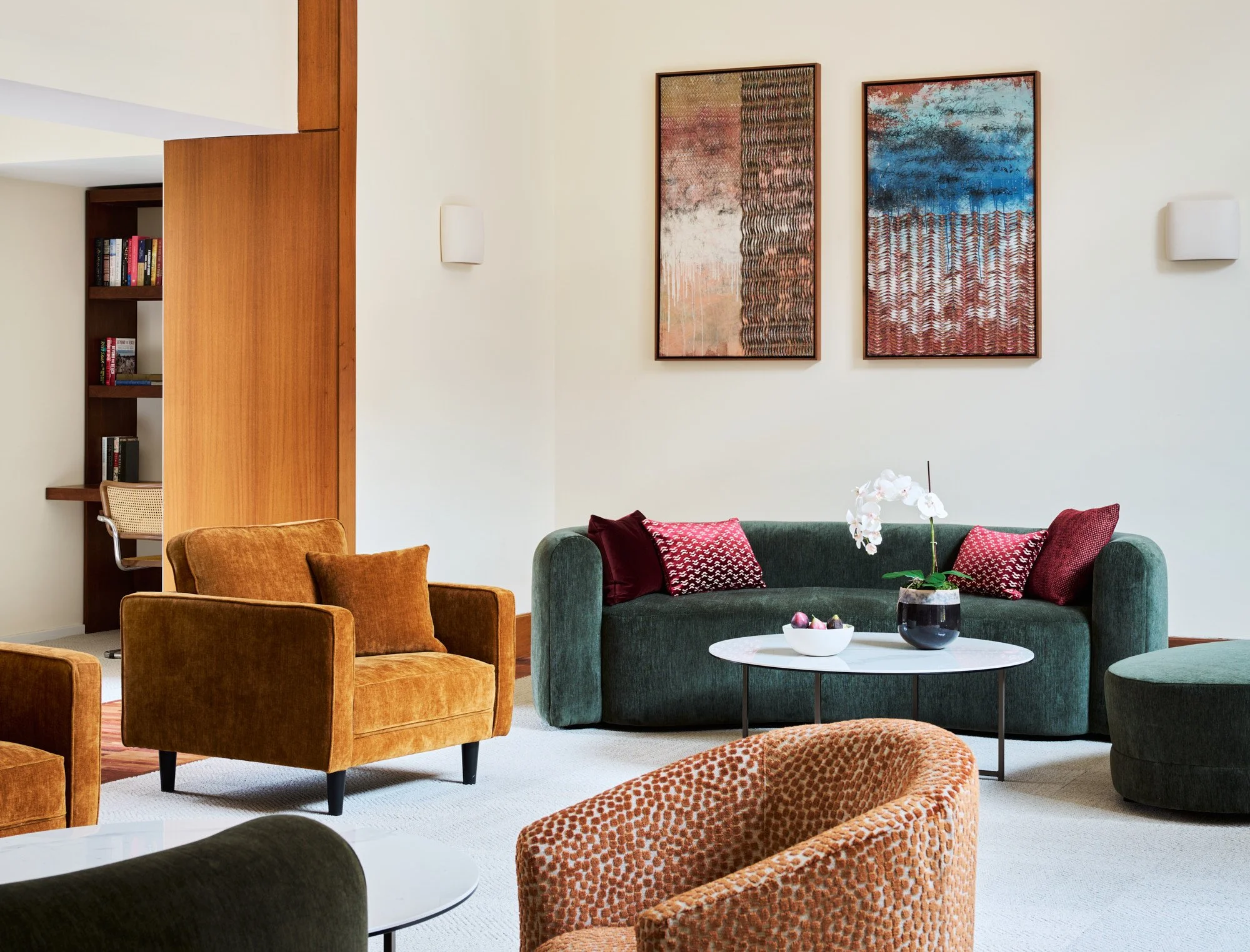 Our mandate was to transform the original lobby it into a welcoming, cozy living room that features warm, earthy colors. We changed the angularity and permeabilty of the space by closing four wall openings and selecetd velvety, jewel-colored fabrics for the softly shaped furniture. The elegant drapes and warm wall colors help elevate the true center piece of the space: an amber-colored chandelier with 27 handblown pendants. Carefully curated art pieces on each side of the newly created walls complete the homey atmosphere in the lobby and play with our color scheme. Four custom-made credenzas and console tables were fabricated from the wood that we carefully reclaimed by closing the four wall openings. The costum-made inglenook shelves create secluded work places and a library for the building’s residents.